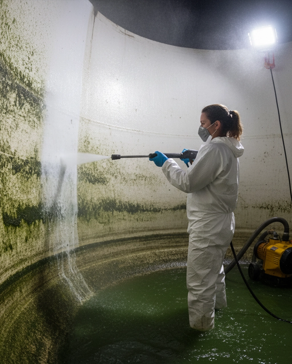 A caixa d'água é esvaziada por completo. Utilizamos equipamentos específicos para remover todo o lodo, detritos e impurezas acumuladas no fundo e nas paredes.